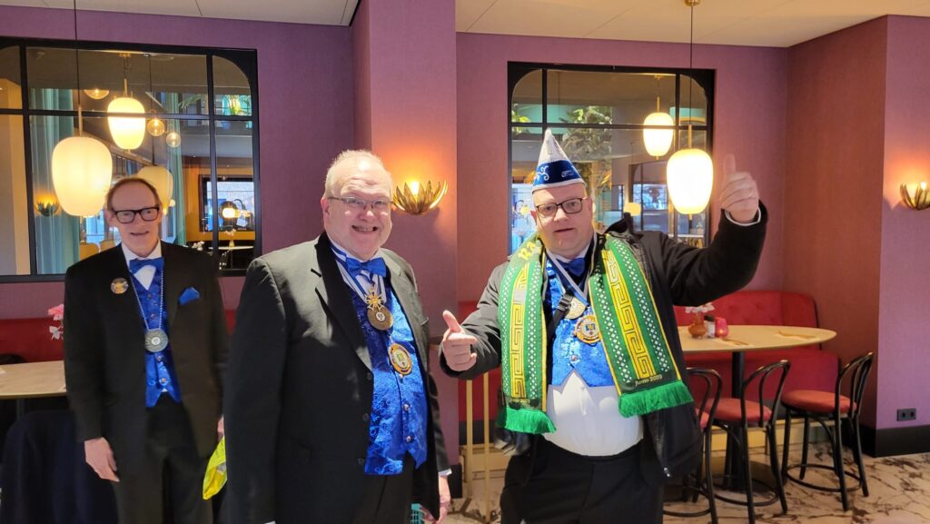 Rolf (mit möts) waerd gefillisieteerd door veurzitter Hein Jambroers (zónger möts) mit zien 3 x 11 jubelejum en krieg de medalie van verdeenste ómgehange.